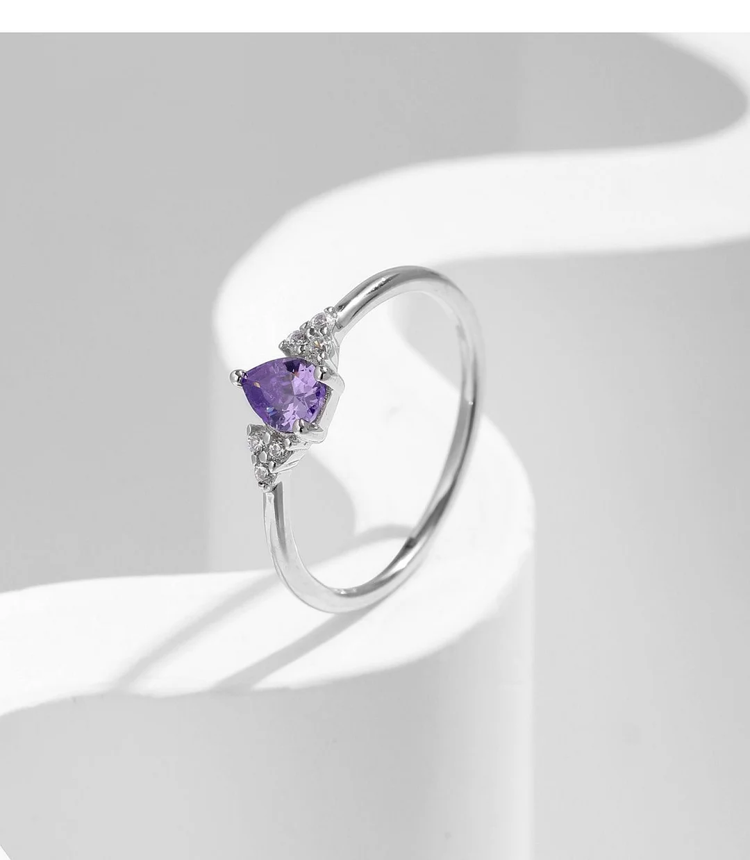 A delicate and feminine design featuring a vibrant 0.35ct pear-shaped Amethyst at the center. The sides are adorned with a sparkling cluster of 6 round moissanites (0.2ctw), adding refined brilliance. Crafted in 925 sterling silver plated with 10K gold, this ring brings together elegance, color, and modern simplicity—perfect for daily wear or gifting.