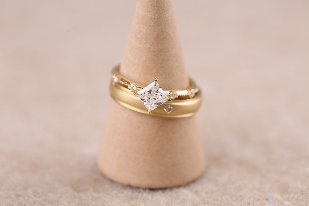 A beautifully matched 18K yellow gold couple ring set featuring a refined men’s band and a stunning women’s ring. The men's ring is minimalist with a single 0.033ct princess-cut lab diamond, while the women's ring showcases a brilliant 2.3ct princess-cut center stone complemented by four 0.04ct round diamonds set in elegant five-prong settings. A perfect expression of love, balance, and unity.